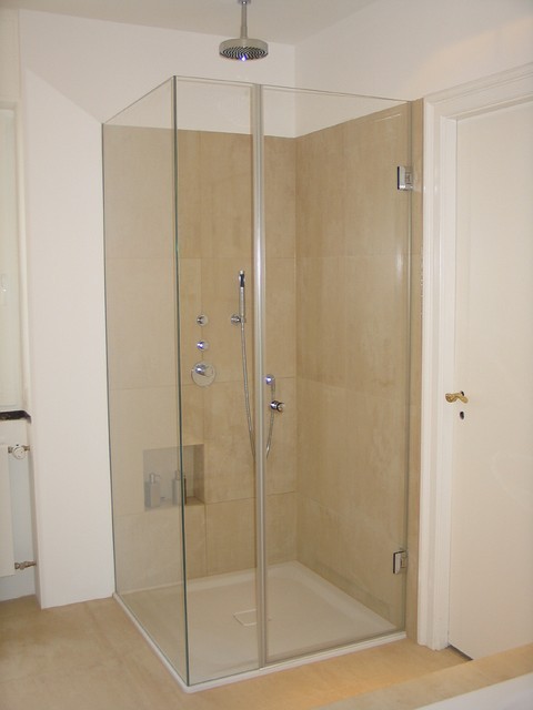 Скляні душові двері використовують переважно в тих випадках, коли є потреба забезпечити вхід у душовий кут, утворений двома або трьома стінами. Зазвичай таку нішу можна організувати із застосуванням душових стінок, замість капітальних стін. Скляні душові двері виконуються із загартованого скла завтовшки 8 мм. Двері можуть виготовлятися з безбарвного, матового або тонованого в масі скла, а також матовий малюнок може наноситися прямо на скло з використанням технології піскоструминного оброблення.